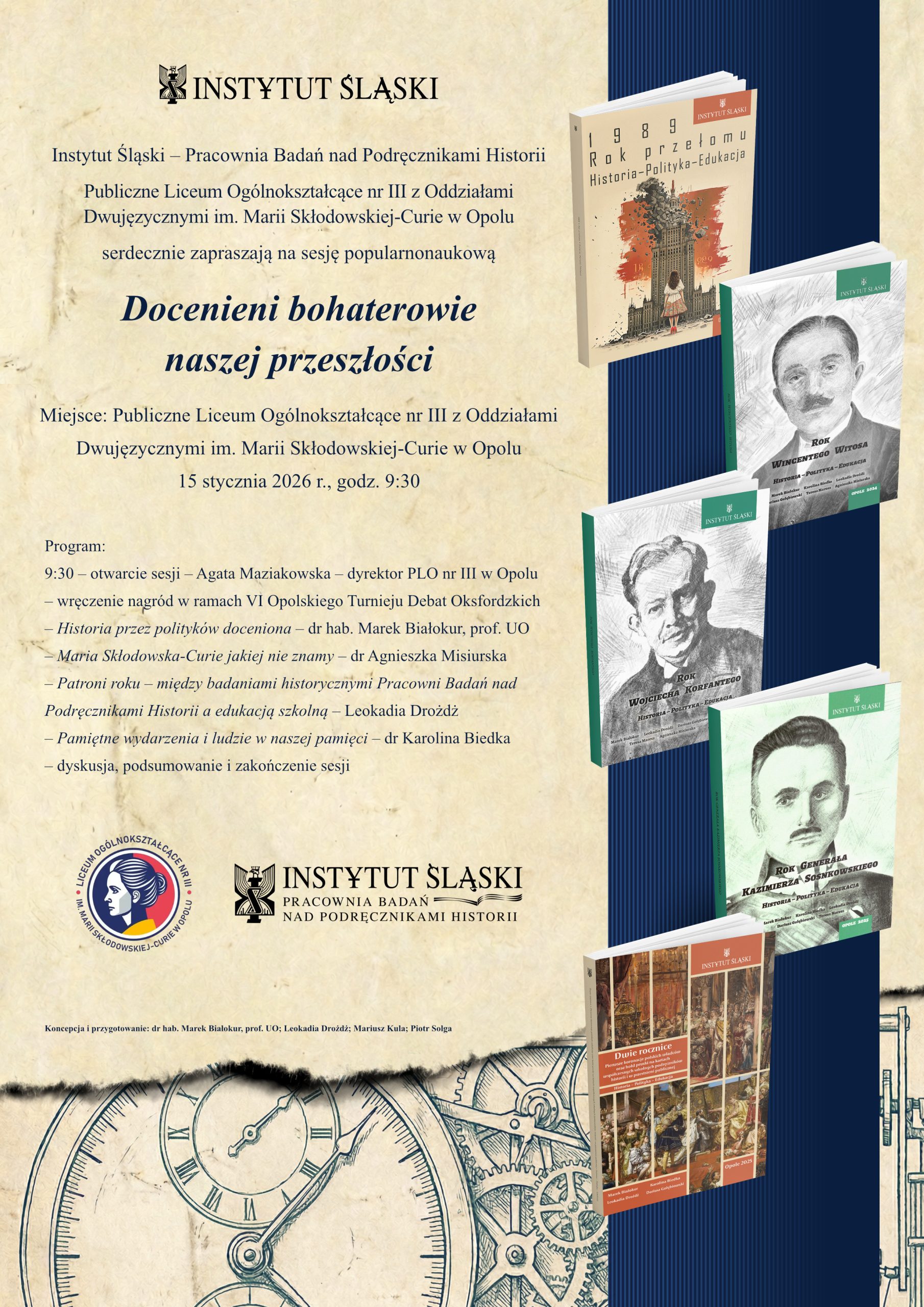 Serdecznie zapraszamy na sesję popularnonaukową pt. „Docenieni bohaterowie naszej przeszłości” do Publicznego Liceum Ogólnokształcącego nr III z Oddziałami Dwujęzycznymi im. Marii Skłodowskiej-Curie w Opolu – już w najbliższy czwartek, 15 stycznia 2026 r. o godz. 9.30.