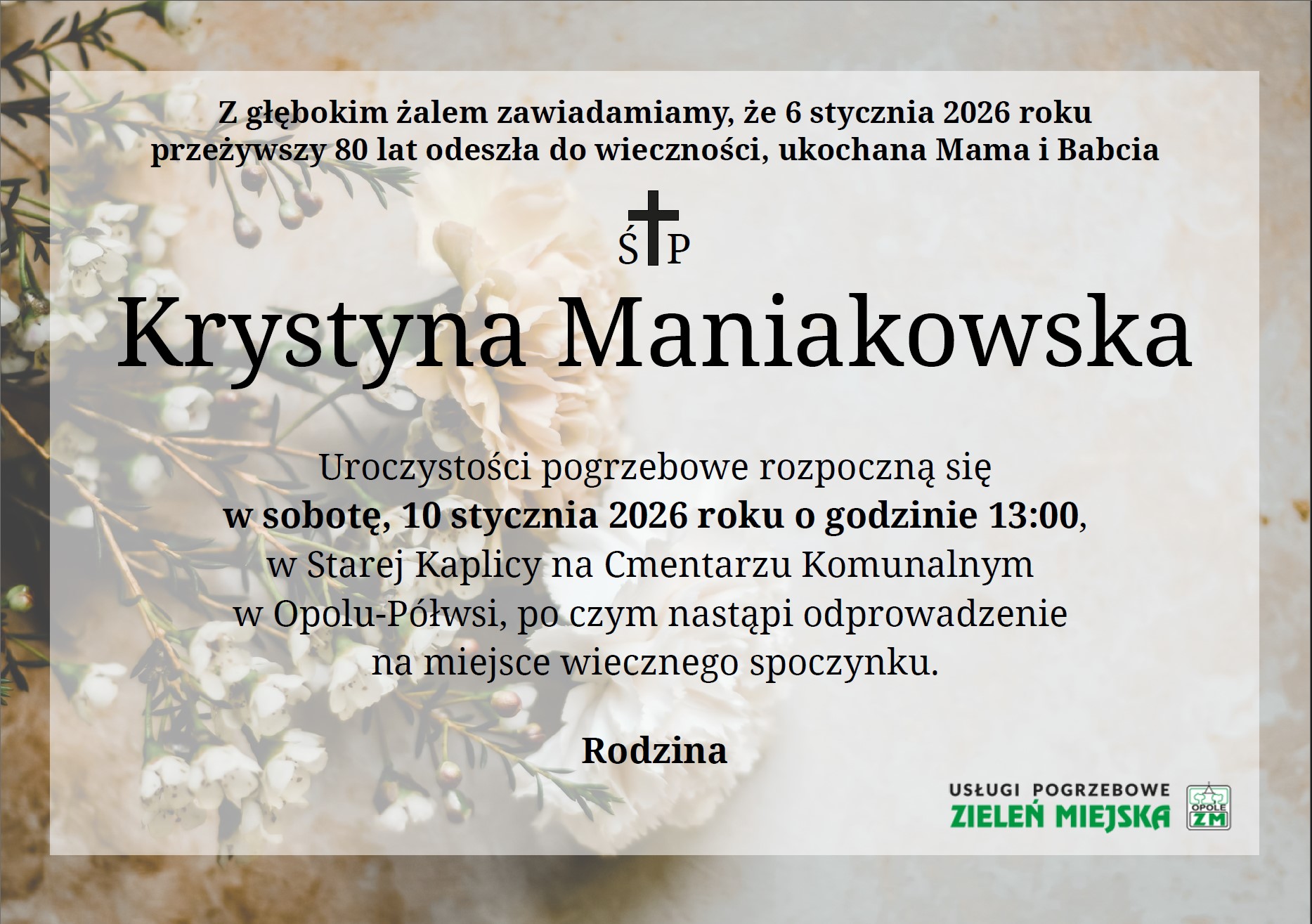 Jej pogrzeb odbędzie się 10 stycznia (sobota) o godz. 13.00 na Cmentarzu Komunalnym w Opolu-Półwsi.